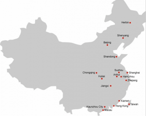 China: Xiamen, Shanghai, Suzhou, Hangzhou, Zhejiang Kinghua City, Anhui Hsiang Zhen City, Jiangxi Hueichang City, Shandong Tszbao City, Hubei Hsiangfan City, Beijing, Kuanzhou City, Shenzen City, Chongqing City, Harbin City, Hong Kong, Macau.